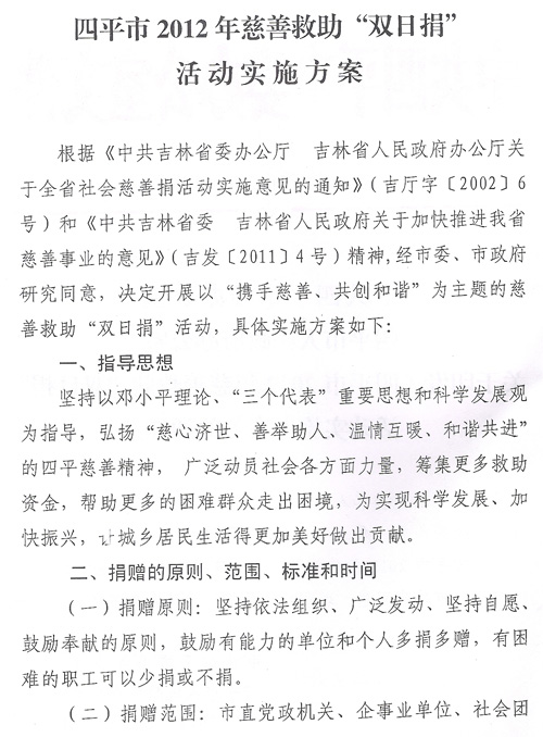 四平市2012年慈善救助“双捐日”活动实施方案